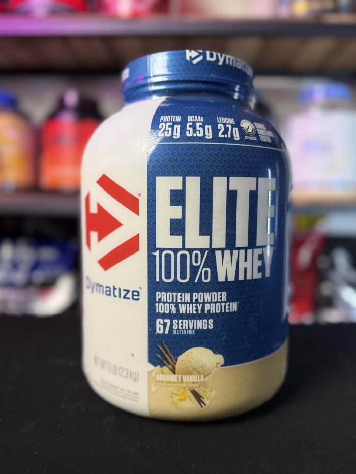 وی الایت (Elite 100% Whey – Dymatize) در هر سروینگ حدود ۲۵ گرم پروتئین دارد و تقریباً ۱۴۰ کالری انرژی تولید میکند.
